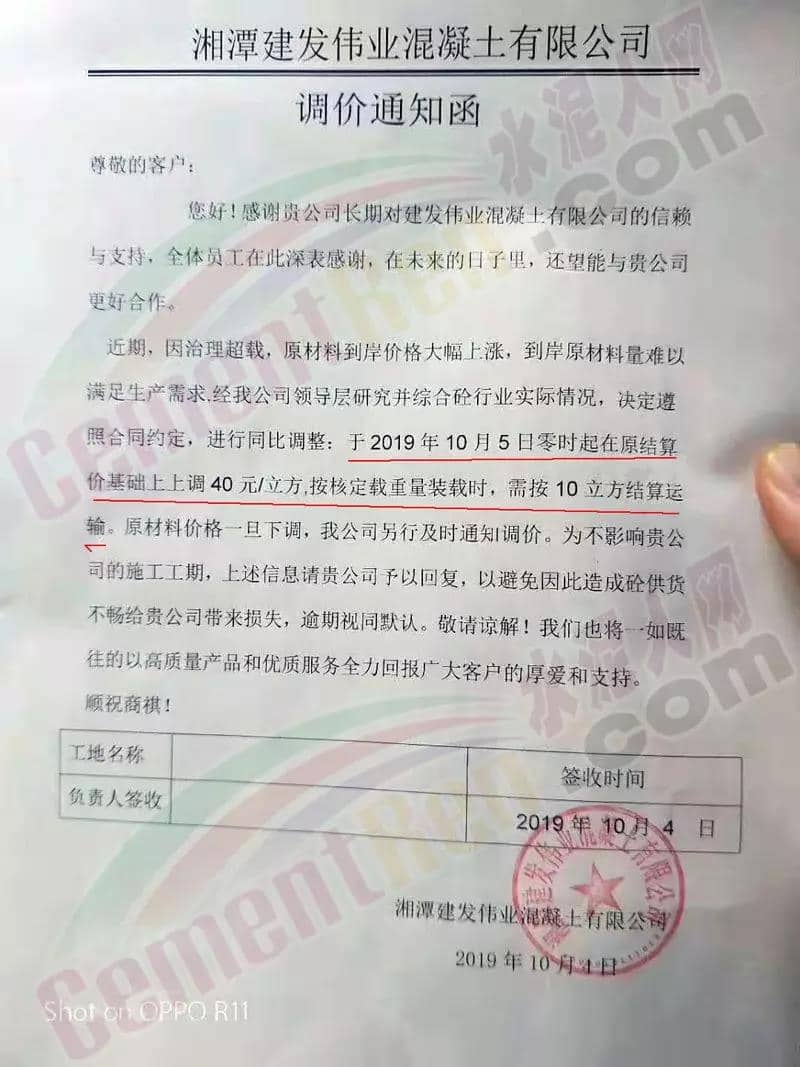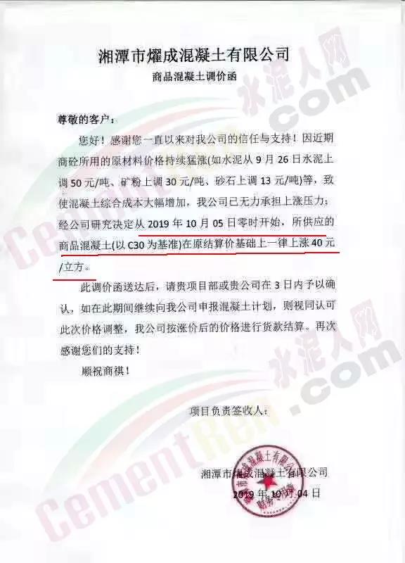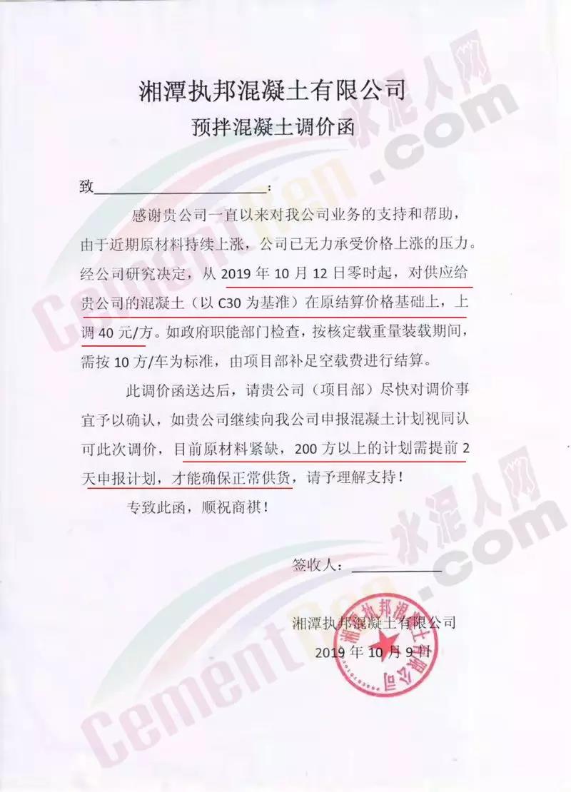 或受上述因素影響,湖南部分區(qū)域混凝土企業(yè)通知上調(diào)砼產(chǎn)品價格。其中湘潭執(zhí)邦混凝土有限公司預(yù)拌混凝土調(diào)價函稱,自10月12日零時起,C30上調(diào)40元/方,且200方以上的計劃需提前兩天申請。