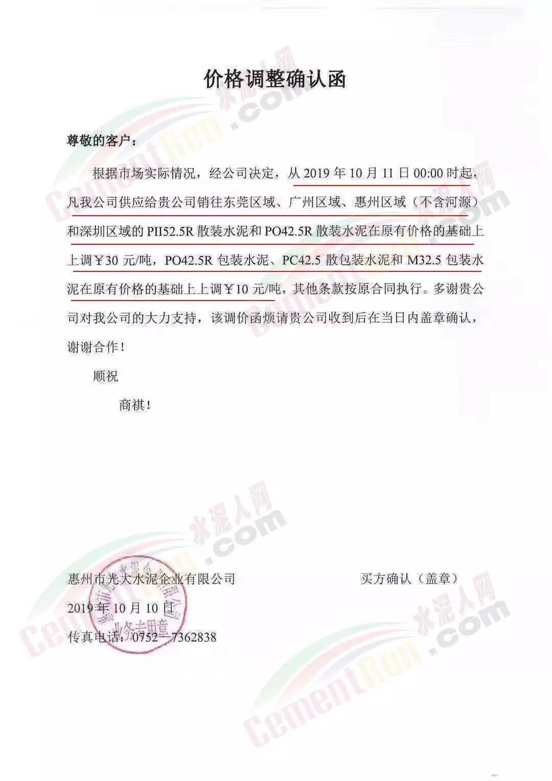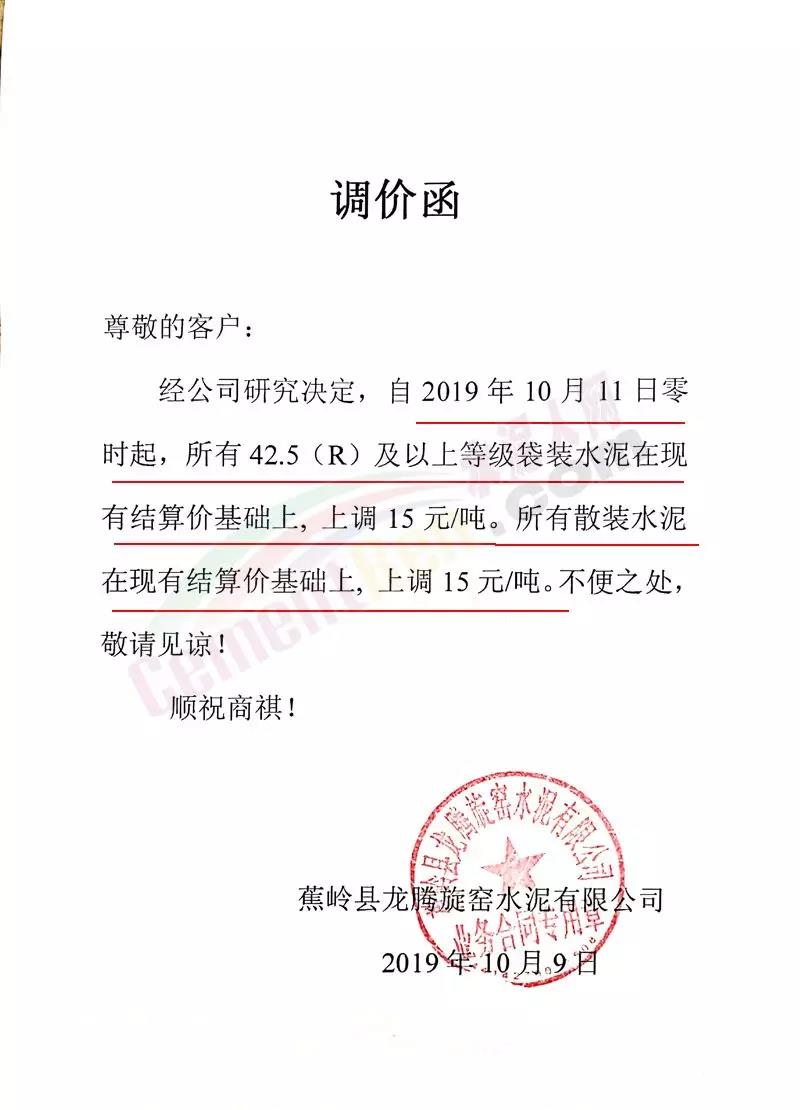 水泥企業(yè)主方面,華南珠三角珠海海中貿(mào)易公司通知稱,根據(jù)當前行情公司的產(chǎn)銷形勢,于10月起上調(diào)出廠價格30元/噸。