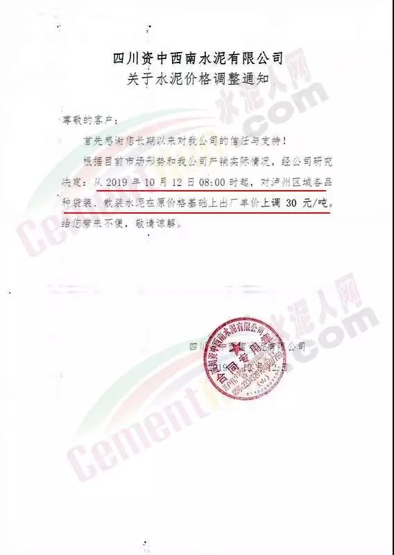 根據(jù)當(dāng)前市場形勢及公司經(jīng)營情況,本公司決定:于2019年10月13日0時起各品種水泥價格上調(diào)30元/噸。