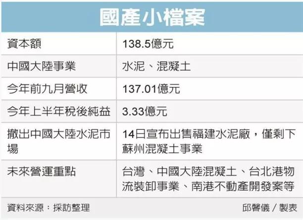 臺(tái)灣島內(nèi)預(yù)拌混凝土龍頭國產(chǎn)實(shí)業(yè)10月14日宣布,將福建龍巖水泥廠以人民幣4.08億元(約新臺(tái)幣17.9億元)出售給福建當(dāng)?shù)卮厚Y集團(tuán),外界解讀國產(chǎn)實(shí)業(yè)退出大陸水泥生產(chǎn)市場;國產(chǎn)表示,回收資金將朝瘦身或建材通路相關(guān)事業(yè)進(jìn)行并購發(fā)展?! ≡诖箨懓l(fā)展的臺(tái)灣水泥企業(yè)包括臺(tái)泥、亞泥、信大、國產(chǎn)等,國產(chǎn)過去在湖南、福建有水泥廠,五年前湖南廠出售80%股權(quán)給海螺,僅剩下福建,年產(chǎn)能約250萬公噸,此次出售也宣告國產(chǎn)實(shí)業(yè)在大陸市場的水泥產(chǎn)業(yè)布局結(jié)束。國產(chǎn)股價(jià)已連續(xù)倆個(gè)交楊日飆出漲停板。