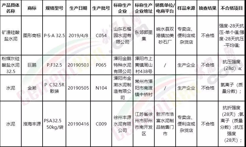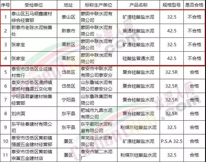 山東泰安4批次樣品不合格,抽樣合格率為63.6%據(jù)通報(bào),泰安市市場(chǎng)監(jiān)管局于2019年8月至10月在全市范圍內(nèi)組織開(kāi)展了第一批流通領(lǐng)域水泥商品質(zhì)量監(jiān)督抽查。本次共監(jiān)督抽查10家經(jīng)營(yíng)部,抽取11批次樣品。其中檢出4批次樣品不合格,本次水泥商品抽樣合格率為63.6%。4個(gè)批次不合格水泥基本情況:2批次礦渣硅酸鹽水泥和2批次普通硅酸鹽水泥;標(biāo)稱(chēng)生產(chǎn)單位均為蒙陰中聯(lián)水泥有限公司;標(biāo)識(shí)生產(chǎn)單位地址均為山東省蒙陰縣蒙陰鎮(zhèn)東城村;包裝袋上標(biāo)注商標(biāo)均為蒙陰中聯(lián);不合格樣品的不合格項(xiàng)目主要有氯離子、燒失量、3天強(qiáng)度、28天強(qiáng)度等。經(jīng)營(yíng)者分別是泰山區(qū)五馬順鑫建材綜合經(jīng)營(yíng)部,新泰市老陳水泥銷(xiāo)售處,北集坡鎮(zhèn)張家寶。泰安市2019年度流通領(lǐng)域水泥商品質(zhì)量第一批專(zhuān)項(xiàng)監(jiān)督抽查結(jié)果總匯表