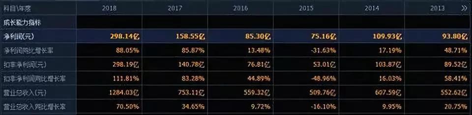 從公司的營(yíng)收、凈利潤(rùn)等幾個(gè)主要成長(zhǎng)能力指標(biāo)來(lái)看,2014至2018年五年間,公司營(yíng)收分別為607.59億、509.76億、559.32億、753.11億、1284.03億,營(yíng)收同比增速為9.95%、-16.1%、9.72%、34.65%、70.50%,綜合來(lái)看近10年平均營(yíng)收增速21%,近五年為22%。