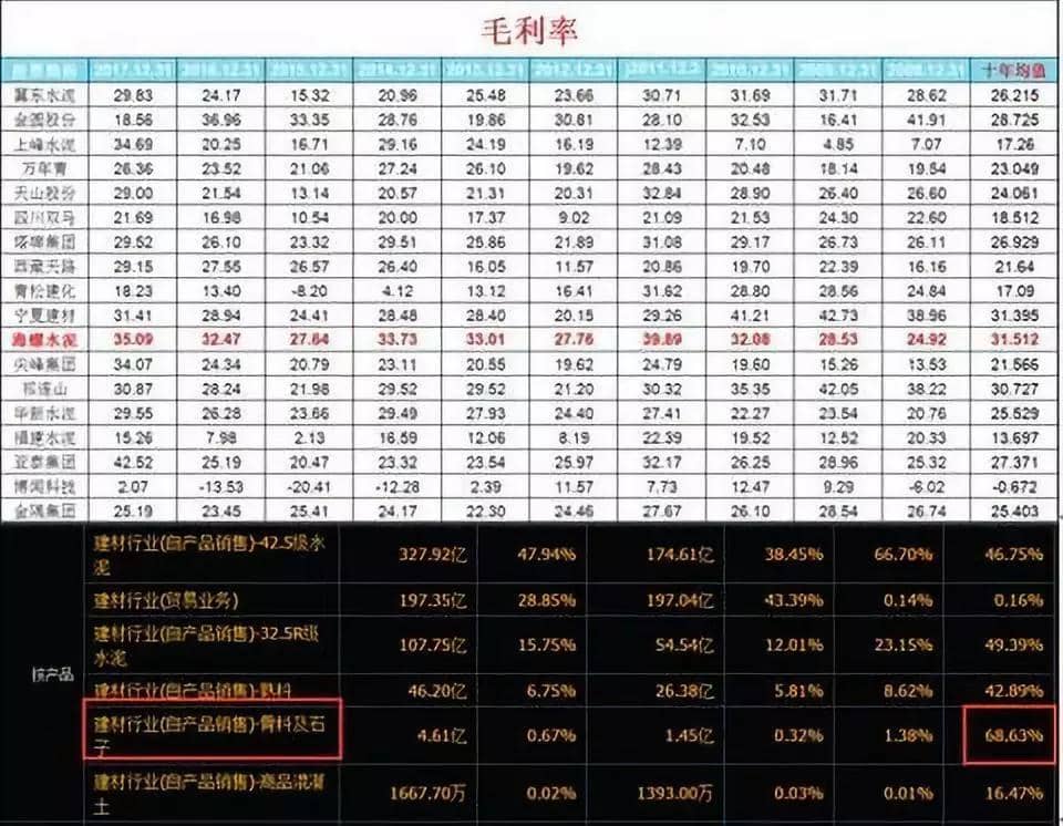 這里匯總了18家上市公司近十年的毛利率情況。毫無(wú)懸念,海螺水泥毛利率十年均值是同行業(yè)最高的。從產(chǎn)品的角度來(lái)看,我們很難看出到底是哪一類產(chǎn)品決定著毛利率,因?yàn)楹B菟嗟漠a(chǎn)品中前三種幾乎差不了多少。