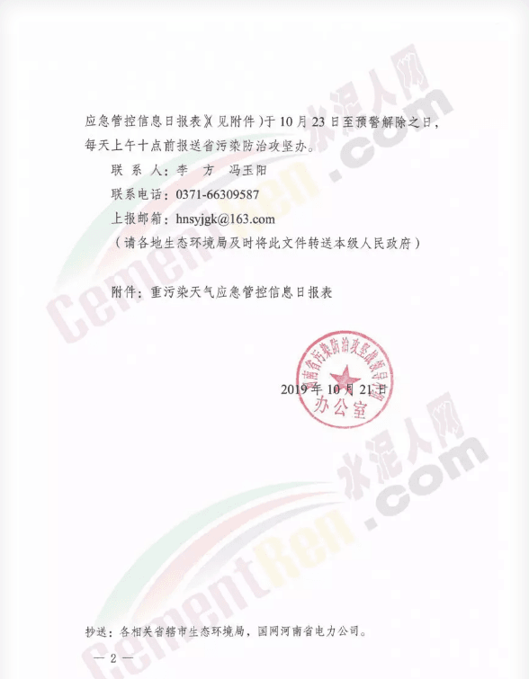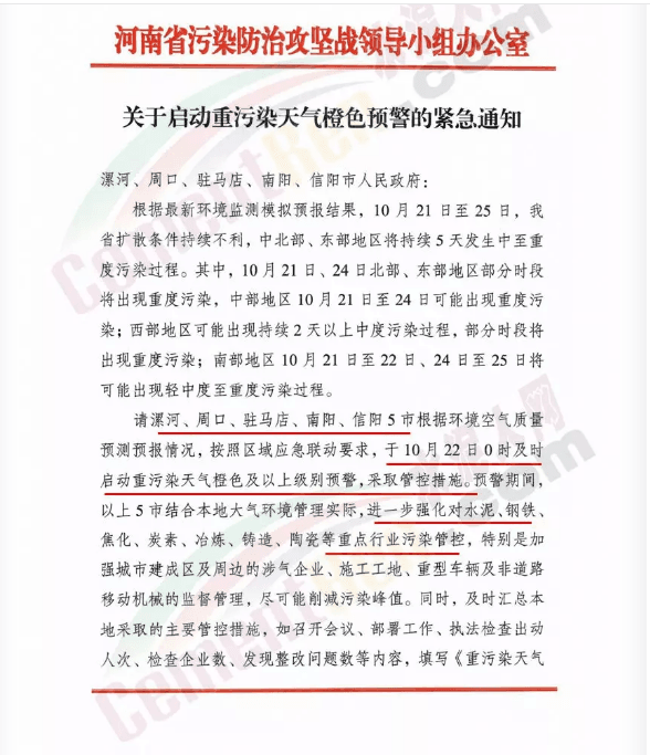 水泥人網(wǎng)消息,日前河南省污染防治攻堅戰(zhàn)領導小組辦公室發(fā)布的《關于啟動重污染天氣橙色預警的緊急通知》要求漯河、周口、駐馬店、南陽,信陽5個地區(qū)根據(jù)環(huán)境空氣質量預測預報情況,按照區(qū)域應急聯(lián)動要求,于10月22日0時及時啟動重污染天氣橙色及以上級別預警,采取管控措施。