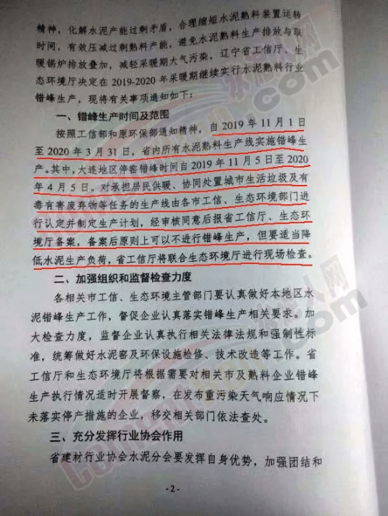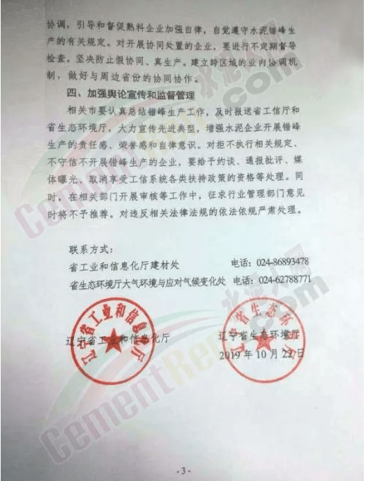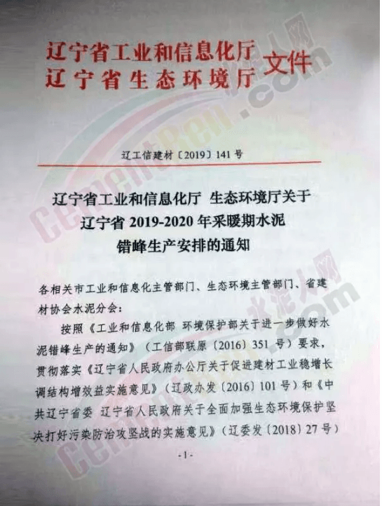 水泥人網(wǎng)消息:日前,遼寧省工業(yè)和信息化廳、生態(tài)環(huán)境廳聯(lián)合下發(fā)關(guān)于《遼寧省2019年-2020年采暖期水泥錯(cuò)峰生產(chǎn)安排的通知(遼工信建材【2019】141號)》文件要求,2019年11月1日至2020年3月31日,省內(nèi)所有水泥熟料生產(chǎn)線實(shí)施錯(cuò)峰生產(chǎn)。其中大連地區(qū)停窯錯(cuò)峰時(shí)間自11月5日至2020年4月5日。