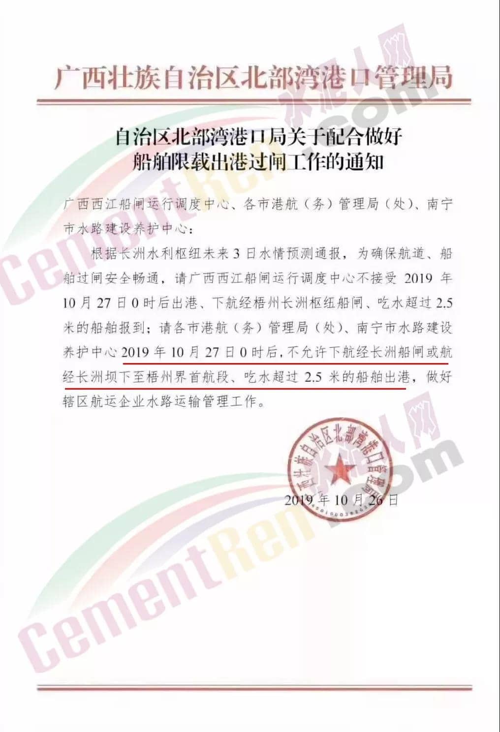 據(jù)水泥人網(wǎng)了解,26日廣西壯族自治區(qū)北部灣港口管理局發(fā)布《自治區(qū)北部灣港口局關(guān)于配合做好船舶限載出港過閘工作的通知》稱,根據(jù)長洲水利樞紐未來3日水情預(yù)測通報(bào),為確保航道、船舶過閘安全暢通,請(qǐng)廣告西西江船閘運(yùn)行調(diào)度中心不接受2019年10月27日0時(shí)后出港、下航經(jīng)梧州長洲樞紐船閘、吃水超過2.5米的船舶報(bào)道。請(qǐng)各市港航(務(wù))管理局(處)、南寧市水路建設(shè)養(yǎng)護(hù)中心2019年10月27日0時(shí)后,不允許下航經(jīng)長洲船閘或航經(jīng)長洲壩下至梧州界首航段,吃水超過2.5米的船舶出港,做好轄區(qū)航運(yùn)企業(yè)水路運(yùn)輸管理工作。