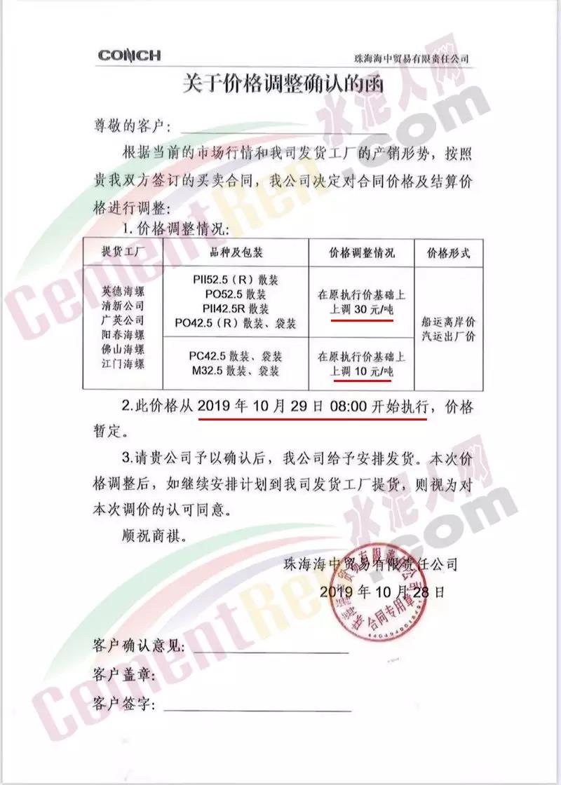 同期,珠海海中貿(mào)易有限責(zé)任公司發(fā)布關(guān)于價(jià)格調(diào)整確認(rèn)的函稱:根據(jù)當(dāng)前的市場行情和公司發(fā)貨工廠的產(chǎn)銷形勢,公司決定對(duì)合同價(jià)格及結(jié)算價(jià)格進(jìn)行調(diào)整,新價(jià)格從10月29日8點(diǎn)開始執(zhí)行。