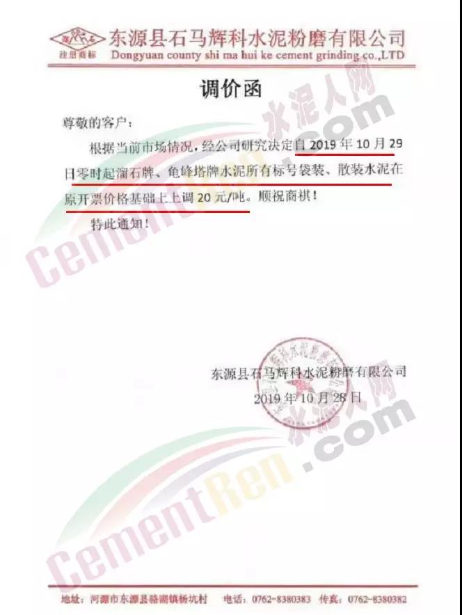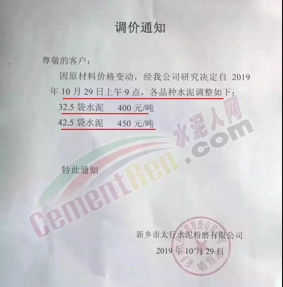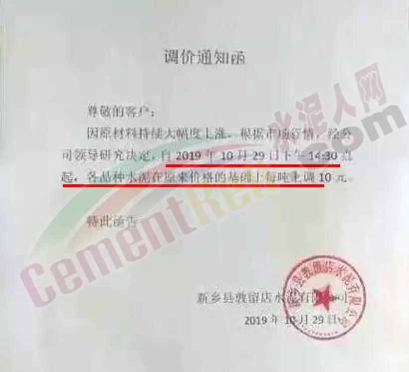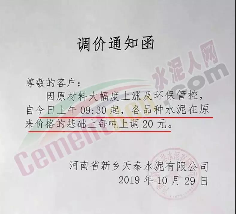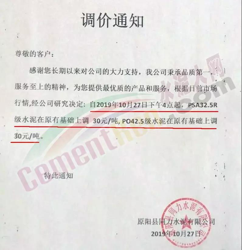 通知:今天(10月29日)中午12點(diǎn)起,春江水泥在原價(jià)基礎(chǔ)上每噸上調(diào)20元。