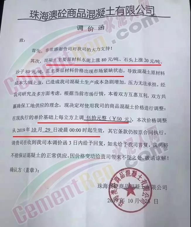 珠海澳砼商量混凝土有限公司調(diào)價(jià)函稱,混凝土主要原材料水泥上漲80元/噸、石頭上漲20元/噸、沙子80元/噸,且主要原材料價(jià)格出現(xiàn)市場緊缺狀態(tài),導(dǎo)致混凝土原材料成本大幅上漲,已造成公司混凝土生產(chǎn)成本急劇增加,壓力無法承擔(dān)。公司決定對(duì)商品混凝土價(jià)格進(jìn)行調(diào)整,在現(xiàn)執(zhí)行單價(jià)基礎(chǔ)上上調(diào)50元/立方,本次價(jià)格調(diào)整從10月29日凌晨0時(shí)起生效。