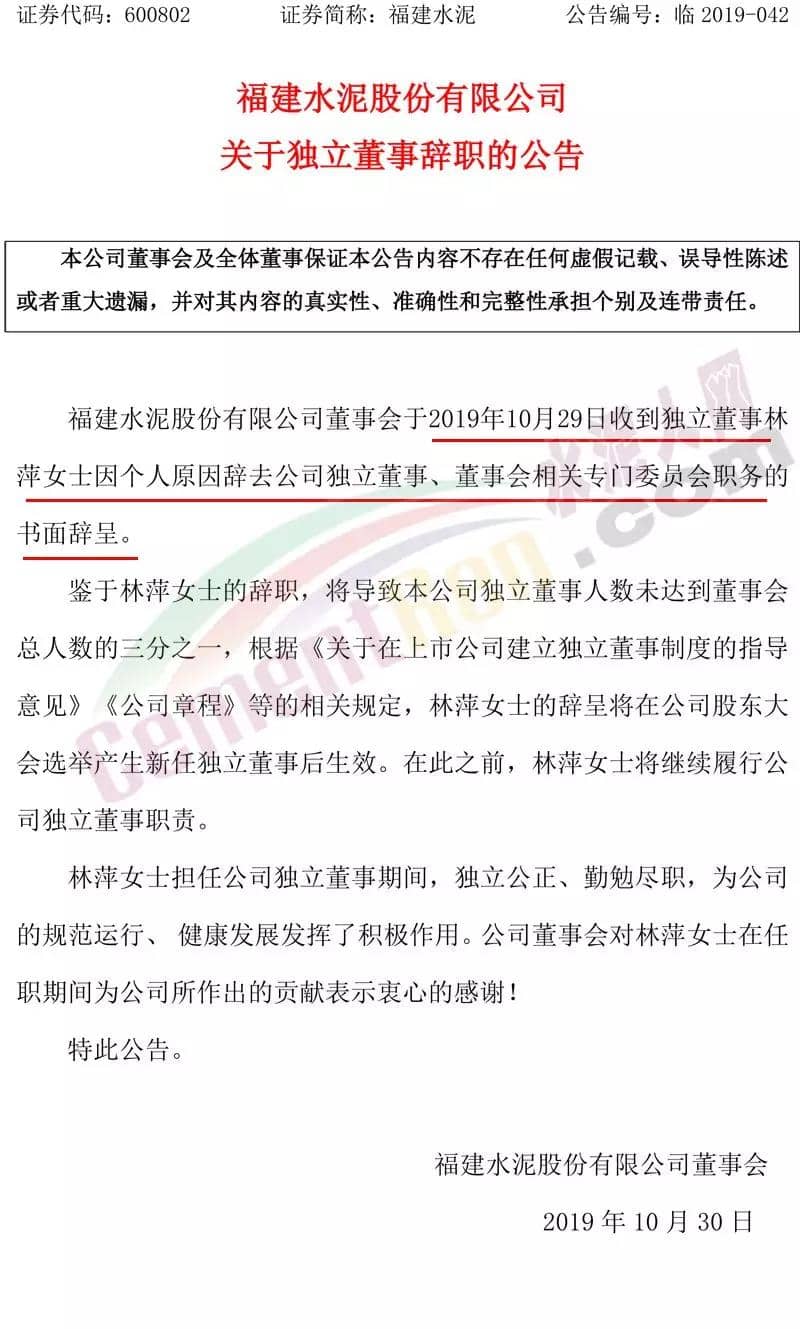 福建水泥:10月29日,福建水泥股份有限公司(600802)董事會(huì)于2019年10月29日收到獨(dú)立董事林萍因個(gè)人原因辭去公司獨(dú)立董事、董事會(huì)相關(guān)專門委員會(huì)職務(wù)的書(shū)面辭呈。林萍自2016年8月12日任獨(dú)立董事,最新一期披露的年薪為4萬(wàn)元。其任職期間公司股價(jià)下跌11.2%,當(dāng)日股價(jià)下跌4.04%。林萍任職期間,福建水泥市值從31.65億元跌至28.14億元,市值縮水了3.51億元。最新財(cái)報(bào)顯示,福建水泥股份有限公司2019年第三季度營(yíng)業(yè)總收入為19.75億,同比下滑1.04%;歸屬凈利潤(rùn)為2.58億,同比下滑19.91%。福建水泥股份有限公司始創(chuàng)于1958年,具有五十多年的歷史,為福建省傳統(tǒng)企業(yè),公司主要從事水泥及熟料的生產(chǎn)及銷售,是福建地區(qū)產(chǎn)能規(guī)模具大的水泥制造企業(yè),生產(chǎn)的產(chǎn)品主要有“建福”和“煉石”兩個(gè)品牌的各等級(jí)硅酸鹽水泥,通過(guò)公路、鐵路運(yùn)輸渠道,將產(chǎn)品送往福建省各區(qū)域市場(chǎng)。根據(jù)上市企業(yè)數(shù)據(jù)庫(kù)信息顯示:林萍,教授。畢業(yè)于華東理工大學(xué)硅酸鹽工程專業(yè),本科學(xué)歷,獲廈門大學(xué)工商管理碩士學(xué)位和企業(yè)管理博士學(xué)位。現(xiàn)任閩江學(xué)院教授,碩士生導(dǎo)師,兼任全球中小企業(yè)創(chuàng)業(yè)聯(lián)合會(huì)副秘書(shū)長(zhǎng),科技部國(guó)家專家?guī)鞂<?。曾任閩江學(xué)院副教授,美國(guó)哥倫比亞大學(xué)訪問(wèn)學(xué)者。擅長(zhǎng)企業(yè)管理的咨詢,主持十幾項(xiàng)省廳級(jí)課題,在核心刊物發(fā)表論文二十幾篇。公告原文如下: