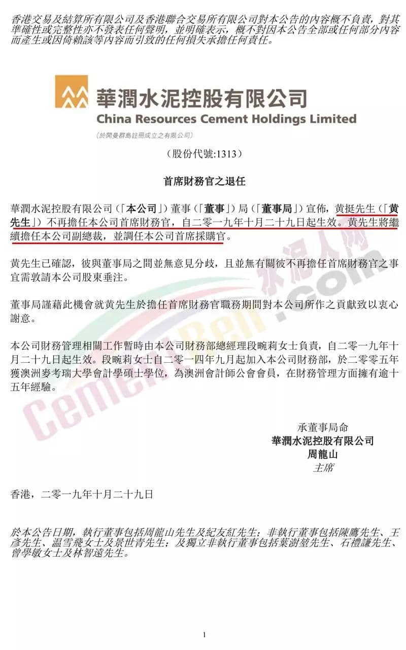 華潤(rùn)水泥控股華潤(rùn)水泥控股(01313)發(fā)布公告,黃挺不再擔(dān)任公司首席財(cái)務(wù)官,自2019年10月29日起生效。黃挺將繼續(xù)擔(dān)任公司副總裁,并調(diào)任公司首席采購(gòu)官。公司財(cái)務(wù)管理相關(guān)工作暫時(shí)由公司財(cái)務(wù)部總經(jīng)理段畹莉負(fù)責(zé),自2019年10月29日起生效。段畹莉自2014年9月起加入公司財(cái)務(wù)部,于2005年獲澳洲麥考瑞大學(xué)會(huì)計(jì)學(xué)碩士學(xué)位,為澳洲會(huì)計(jì)師公會(huì)會(huì)員,在財(cái)務(wù)管理方面擁有逾15年經(jīng)驗(yàn)。公告原文如下: