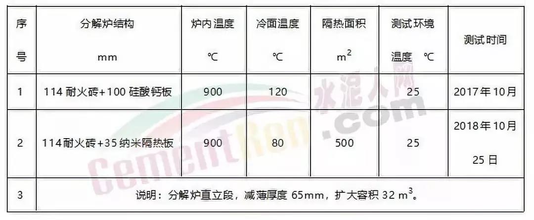 重慶開縣開州水泥有限公司采用天津南極星隔熱材料有限公司35mm納米隔熱材料,代替原有的100mm硅酸鈣板,擴(kuò)大分解爐的內(nèi)部容積。原來的耐火結(jié)構(gòu)是114mm耐火磚和100mm硅酸鈣板,為了擴(kuò)大內(nèi)徑,原耐火磚114mm不變,采用35mm的納米隔熱板代替原來的100mm硅酸鈣板,詳細(xì)情況見表—2。