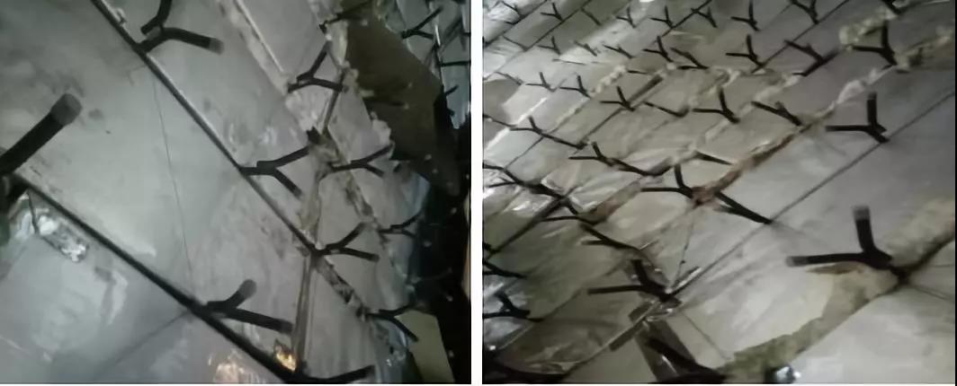 施工中,25mm納米隔熱板分兩層施工,一層15mm隔熱氈粘貼于鋼殼上,然后施工10mm的隔熱氈,兩層隔熱板錯縫施工,下面是冀東鞍山公司的分解爐施工圖—2和圖—3。