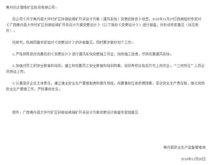 目前的救援方案是通風(fēng)降溫;檢測(cè)檢查有毒有害氣體;加固巷道;盡快到達(dá)事故地點(diǎn)展開(kāi)救援。此外,兩個(gè)專業(yè)救援隊(duì)的后備力量、備用裝備設(shè)施正在趕赴現(xiàn)場(chǎng)。經(jīng)核實(shí),該企業(yè)持有采礦許可證(C4500002014043210134795,有效期:2016年至2024年,礦區(qū)面積4.511平方公里,開(kāi)采標(biāo)高+1075米~-385米(國(guó)家85高程開(kāi)采規(guī)模12.0萬(wàn)t/a,開(kāi)采礦種:鋅、銀、鉛、銻、錫、銅礦)及安全生產(chǎn)許可證:((桂)FM安許證字﹝2018﹞Y0007號(hào),有效期:2018年04月23日至2021年04月22日)。另?yè)?jù)武警廣西總隊(duì)河池支隊(duì)消息,該支隊(duì)已派出40余名官兵趕赴現(xiàn)場(chǎng)。為防止發(fā)生二次事故,危及附近礦區(qū)民眾,武警官兵已對(duì)現(xiàn)場(chǎng)采取警戒。據(jù)河池南丹縣人民政府公開(kāi)信息,2018年,南丹縣安全生產(chǎn)監(jiān)督管理局曾對(duì)大坪村礦區(qū)鋅銀鉛銻礦開(kāi)采設(shè)計(jì)方案(通風(fēng)系統(tǒng))的變更進(jìn)行審查及批復(fù),并要求礦區(qū)嚴(yán)格按照修改完善后的《變更設(shè)計(jì)》進(jìn)行通風(fēng)系統(tǒng)變更施工作業(yè),加快施工進(jìn)度,盡快完善通風(fēng)系統(tǒng)。