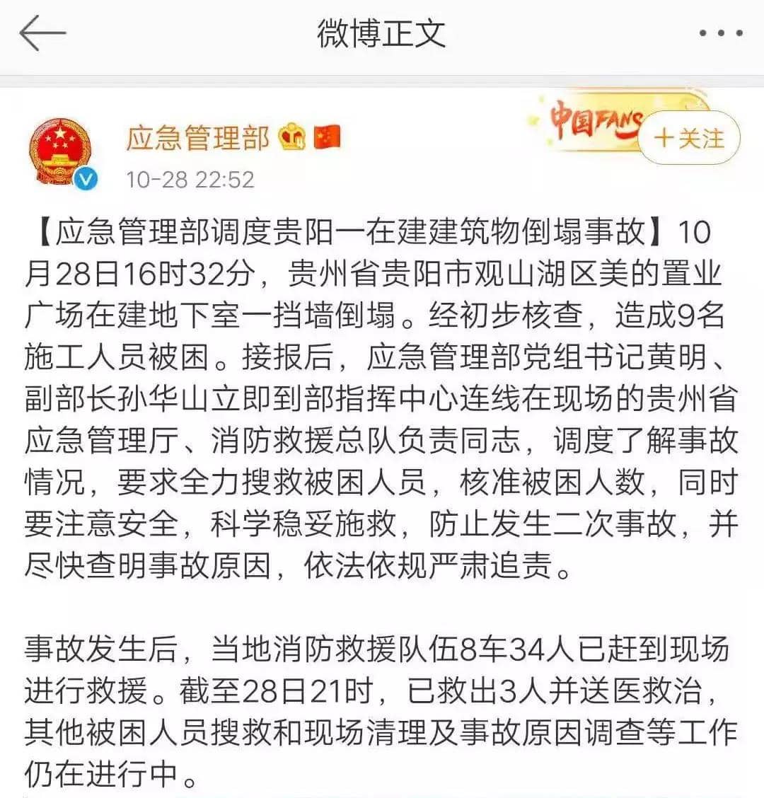 工地發(fā)生坍塌8人死亡,4人受傷 10月28日16時(shí)21分,位于貴州省貴陽(yáng)市觀山湖區(qū)的一在建地下停車場(chǎng)發(fā)生坍塌??逅l(fā)生前,該施工工地上崗當(dāng)班人員共計(jì)14人,事故發(fā)生時(shí)有3人自行逃出,1人被迅速救起,10人被困失聯(lián)。 截至10月29日0時(shí)37分,央視新聞報(bào)道視頻↓↓↓ 截止昨日(29日)凌晨3點(diǎn),10名失聯(lián)人員已經(jīng)全部找到,其中8人死亡,2人受傷。事件中生還的6人中,2人入院治療,垮塌現(xiàn)場(chǎng)救出的2人留院觀察,均生命體征平穩(wěn),沒(méi)有生命危險(xiǎn),其余人經(jīng)檢查身體無(wú)恙已返回住處。 目前,當(dāng)?shù)爻闪⒌膽?yīng)急救援指揮部,正在開(kāi)展受傷人員救治和遇難者家屬善后安撫工作,并對(duì)事故原因進(jìn)行調(diào)查。