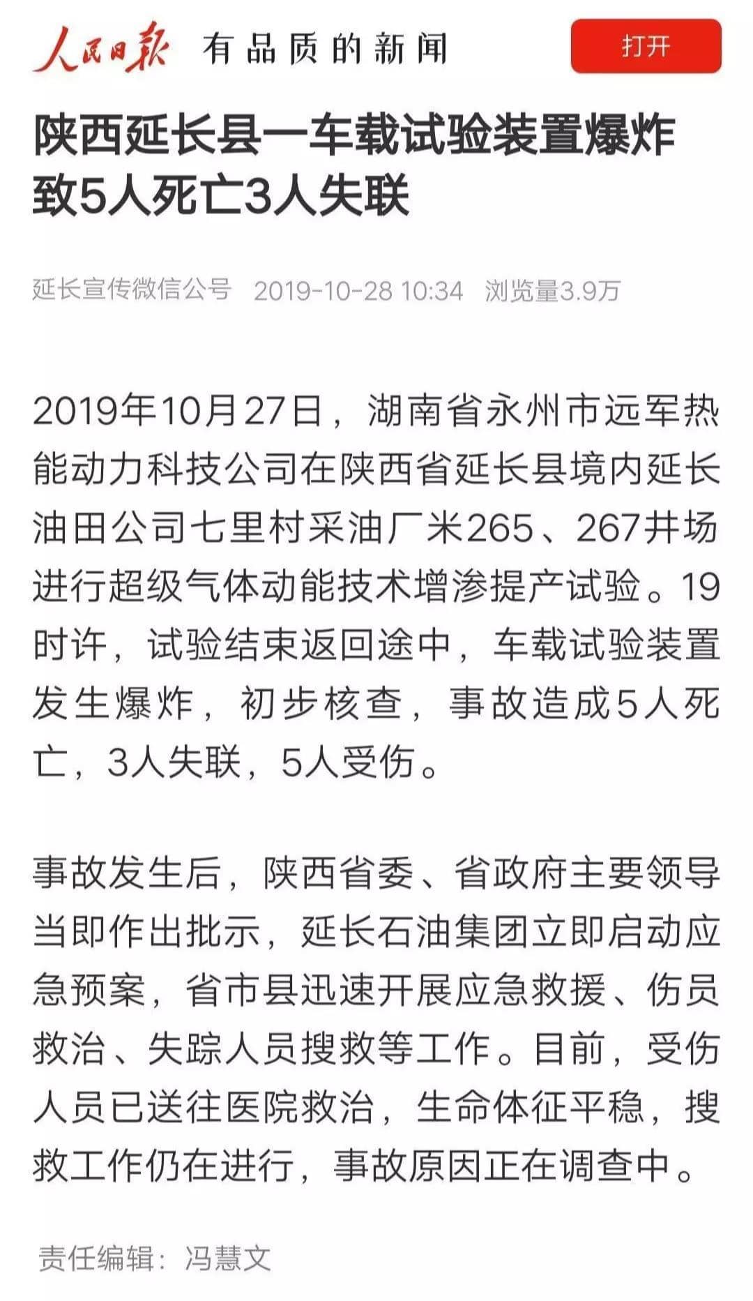 19時(shí)許,試驗(yàn)結(jié)束返回途中,車載試驗(yàn)裝置發(fā)生爆炸,初步核查,事故造成5人死亡,3人失聯(lián),5人受傷。事故發(fā)生后,陜西省委、省政府主要領(lǐng)導(dǎo)當(dāng)即作出批示,延長(zhǎng)石油集團(tuán)立即啟動(dòng)應(yīng)急預(yù)案,省市縣迅速開(kāi)展應(yīng)急救援、傷員救治、失蹤人員搜救等工作。