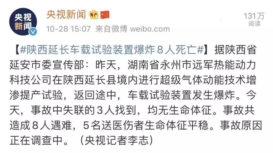 陜西實(shí)驗(yàn)裝備爆炸事故,8死5傷 就在前一天(27日),發(fā)生在陜西省延長(zhǎng)縣一車載試驗(yàn)裝置爆炸致造成8人遇難,5人受傷