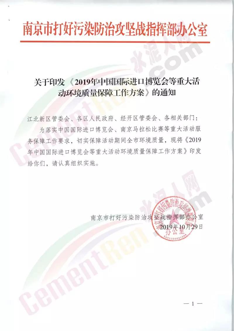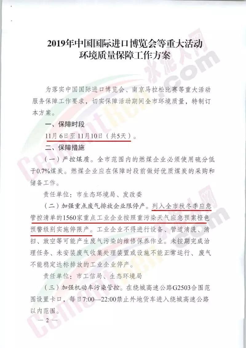 南京市打好污染防治攻堅戰(zhàn)指揮部辦公室發(fā)布《2019年中國國際進(jìn)口博覽會等重大活動環(huán)境質(zhì)量保障工作方案》。保障時段為11月6日至11月10日(共5天)。保障措施包括嚴(yán)控煤質(zhì)及加強(qiáng)重點廢氣排放企業(yè)限停產(chǎn),要求列入全市秋冬應(yīng)急管控清單的1560家重點工業(yè)企業(yè)按照重污染天氣應(yīng)急預(yù)案橙色預(yù)警級別實施停限產(chǎn)。全市主城范圍內(nèi)工業(yè)企業(yè)的柴油貨車停止運輸和裝卸作業(yè),暫停沙石等易揚(yáng)塵污染的物料運輸 ,暫停自卸車傾倒作業(yè)。長江南京靠泊船舶采取使喚用岸電或改燃低硫油等低排放控制措施。暫停長江南京段碼頭和船舶產(chǎn)生大氣污染的裝卸作業(yè),減少大氣污染排放。強(qiáng)化非道路移動機(jī)械管控。實施工地停工,停止所有土方、樁基等易揚(yáng)塵作業(yè),停止渣土運輸 。通知原文如下: