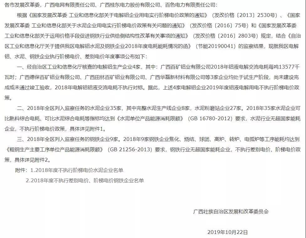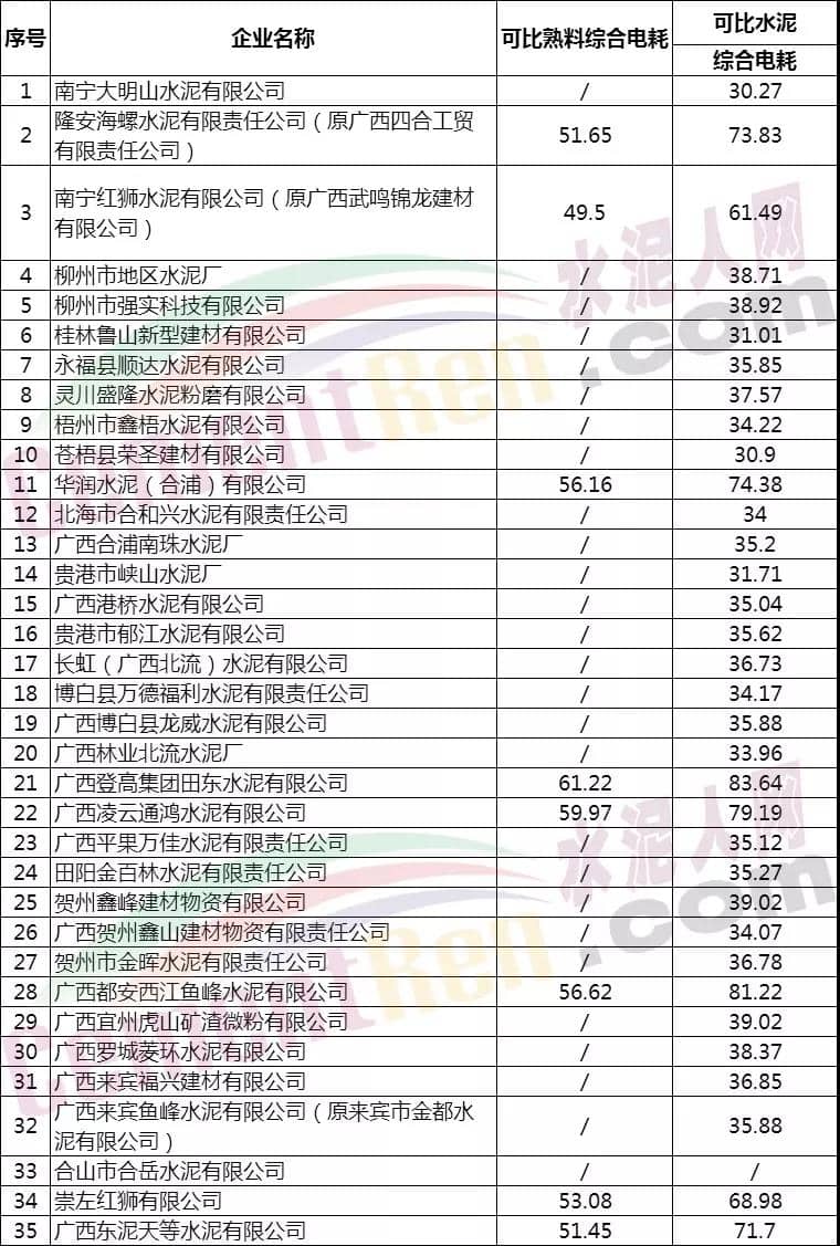 水泥人網(wǎng)消息:日前,廣西壯族自治區(qū)發(fā)改委發(fā)布《廣西壯族自治區(qū)發(fā)展和改革委員會(huì)關(guān)于我區(qū)電解鋁水泥鋼鐵企業(yè)執(zhí)行階梯電價(jià)差別電價(jià)有關(guān)事項(xiàng)的通知》稱(chēng): 2018年全區(qū)列入監(jiān)察任務(wù)的水泥企業(yè)35家,其中完整水泥生產(chǎn)線企業(yè)8家,水泥粉磨站企業(yè)27家。2018年35家水泥企業(yè)可比熟料綜合電耗、可比水泥綜合電耗等指標(biāo)均達(dá)到《水泥單位產(chǎn)品能源消耗限額》(GB 16780-2012)要求,水泥行業(yè)無(wú)超國(guó)家能耗企業(yè),不執(zhí)行階梯電價(jià)政策。