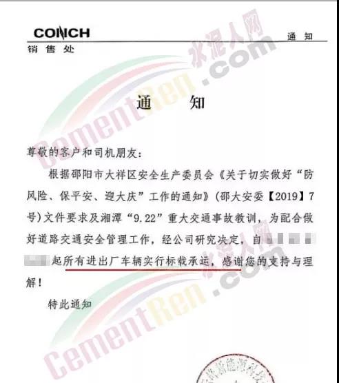 海螺集團旗下邵陽市云峰新能源科技有限公司發(fā)布通知稱,為配合邵陽市大祥區(qū)安委會文件要求及湘潭"9.22"重大交通事故教訓,為配合做好道路交通安全管理工作,經(jīng)公司研究決定,即日起所有進出廠車輛實行標載承運。