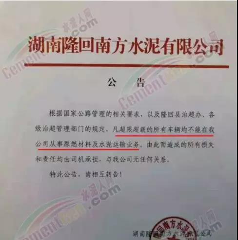 湖南隆回南方水泥有限公司也發(fā)布公告,根據(jù)國家公路管理的相關(guān)要求,以及隆回縣治超辦、各級治超管理部門的規(guī)定,凡超限超載的所有車輛均不能在其公司從事原燃材料及水泥運輸業(yè)務(wù) 。