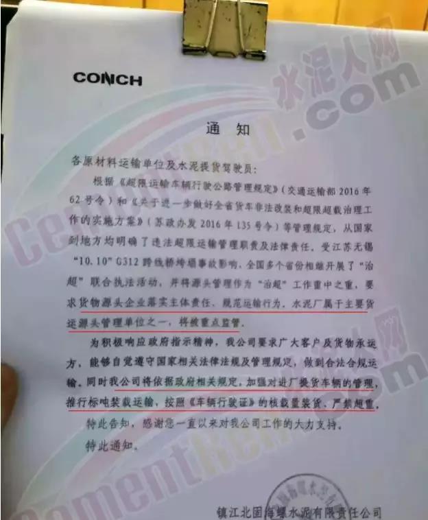 海螺水泥、南方水泥多家企業(yè)高調(diào)宣布拒絕超載 ,超載不讓拉水泥