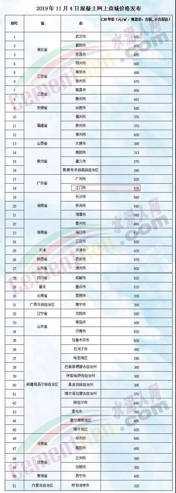據(jù)了解,在生產(chǎn)水泥的過程中礦粉可以替代部分熟料,以減少熟料的摻加量。熟料價格相對較高的區(qū)域,企業(yè)多以礦粉替代部分熟料。南方區(qū)域鋼鐵廠相對較少,熟料價格卻相對較高,礦粉需求量大 ,部分企業(yè)跨區(qū)域從北方地區(qū)采購水渣,以致于成本上漲,產(chǎn)品售價隨著上漲。據(jù)水泥人網(wǎng)了解,近期華中南地區(qū)不僅礦粉價格居高不下,其他混合材產(chǎn)品隨著水泥需求量上漲而上調(diào)出廠價格。混凝土價格大漲,廣東地區(qū)C30混凝土直奔700元/方11月4日,混凝土行業(yè)最大上市公司——中建西部建設(shè)在自己的電商平臺發(fā)布了最新的混凝土報價。廣東、陜西、河南、安徽、山東、四川、重慶、海南等地區(qū)的C30商混價格已經(jīng)突破500元/m³,其中廣東江門地區(qū)已突破630元/m³。并且在報價說明中指出該價格均為現(xiàn)款價,不含稅、不含泵送,還需先付款。