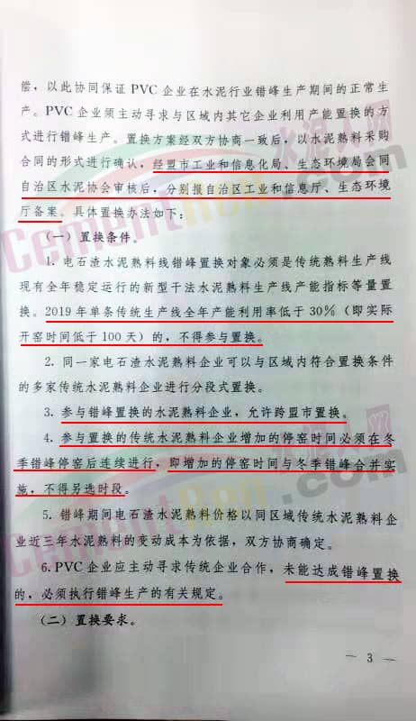 一、實施范圍 自治區(qū)境內(nèi)的所有水泥熟料生產(chǎn)企業(yè)(包括利用電石渣生產(chǎn)水泥熟料企業(yè))均應當進行錯峰生產(chǎn)。其中電石渣水泥企業(yè)僅適用于中西部地區(qū),包括呼和浩特市、包頭市、 烏蘭察布市、鄂爾多斯市、巴彥淖爾市、烏海市、阿拉善盟7個地區(qū),鼓勵個水泥熟料企業(yè)在自愿的前提下,延長增加錯峰生產(chǎn)時間。 二、錯峰時間安排 2019年至2020年度錯峰時間為自2019年11月15日至2020年3月15日共4個月全面實行錯峰生產(chǎn)。 在錯峰期間因特殊情況而無法停業(yè)的企業(yè),必須按照所在地區(qū)錯峰時間安排,與傳統(tǒng)水泥熟料企業(yè)(單條生產(chǎn)線全年產(chǎn)能利用率在30%以上,以實際開窯時間大于100天)在落實自治區(qū)規(guī)定的4個月錯峰生產(chǎn)的基礎上再實行(產(chǎn)能)產(chǎn)量等量置換。 三、電石渣生產(chǎn)水泥熟料錯峰生產(chǎn)安排 確保電石法PVC連續(xù)運行而生產(chǎn)水泥熟料企業(yè),鑒于利用電石渣生產(chǎn)水泥熟料企業(yè)生產(chǎn)的特殊性,允許PVC企業(yè)與傳統(tǒng)企業(yè)熟料線“錯峰置換”,即電石渣水泥企業(yè)在采暖季錯峰生產(chǎn)期間不停窯,由傳統(tǒng)企業(yè)在非錯峰生產(chǎn)期間增加停窯時間予以置換補償。經(jīng)過盟市工業(yè)和信息化局、生態(tài)環(huán)境局同自治區(qū)水泥協(xié)會審核后,分別報自治區(qū)工業(yè)和信息廳、生態(tài)環(huán)境廳備案。具體如下: