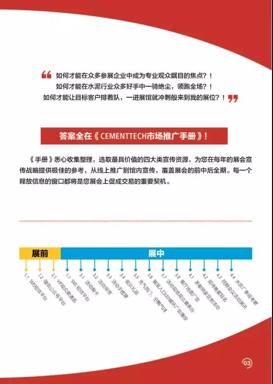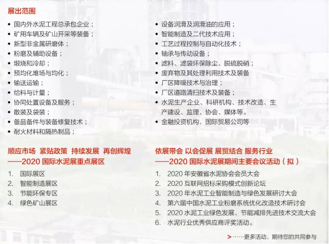中國國際水泥技術(shù)及裝備展作為行業(yè)內(nèi)影響力最大的專業(yè)展,展出面積超過20000平方米,為國際水泥相關(guān)設(shè)備制造商和服務(wù)供應(yīng)商提供客戶開發(fā)、渠道拓展和品牌宣傳維護等專業(yè)服務(wù);憑借十余年的專業(yè)經(jīng)驗,水泥展已成為行業(yè)內(nèi)最具影響力和號召力的服務(wù)貿(mào)易平臺!