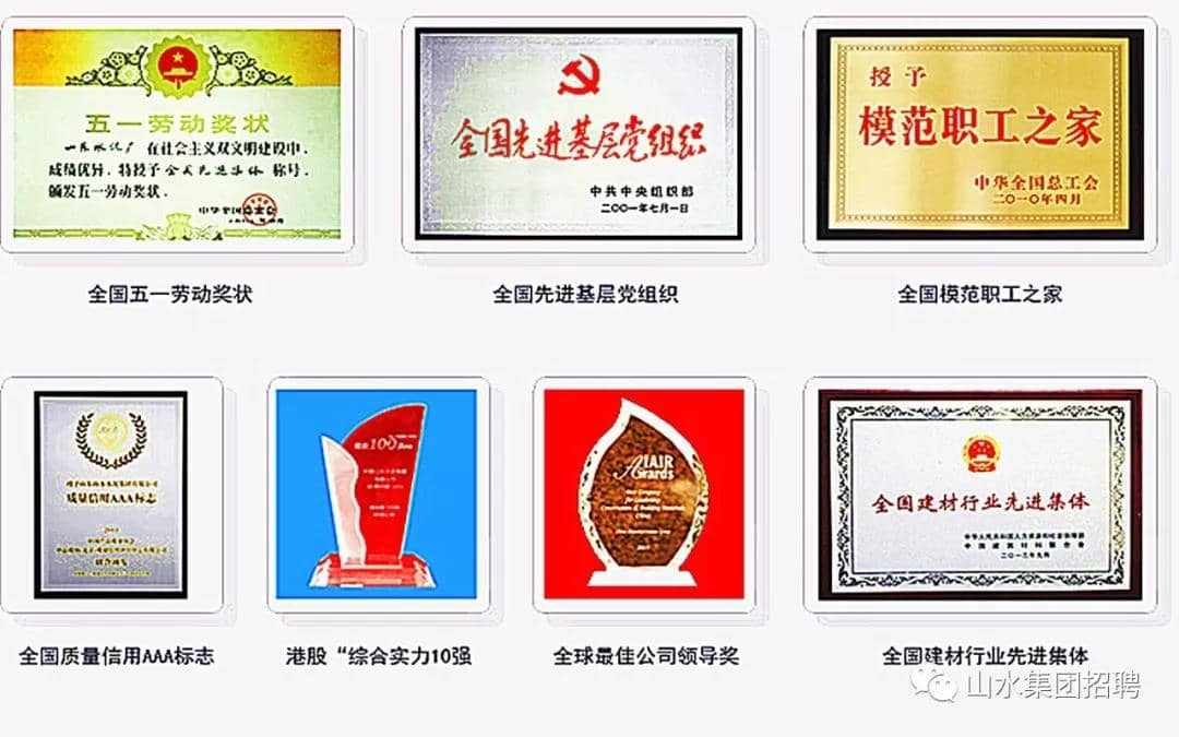 多年來(lái),山水集團(tuán)先后被授予全國(guó)建材系統(tǒng)先進(jìn)集體、全國(guó)五一勞動(dòng)獎(jiǎng)狀、全國(guó)先進(jìn)基層黨組織、全國(guó)模范職工之家、山東省文明單位、山東省納稅百?gòu)?qiáng)企業(yè)、香港上市公司100強(qiáng)、中國(guó)500強(qiáng)、中國(guó)建材行業(yè)20強(qiáng)等榮譽(yù)稱號(hào)。