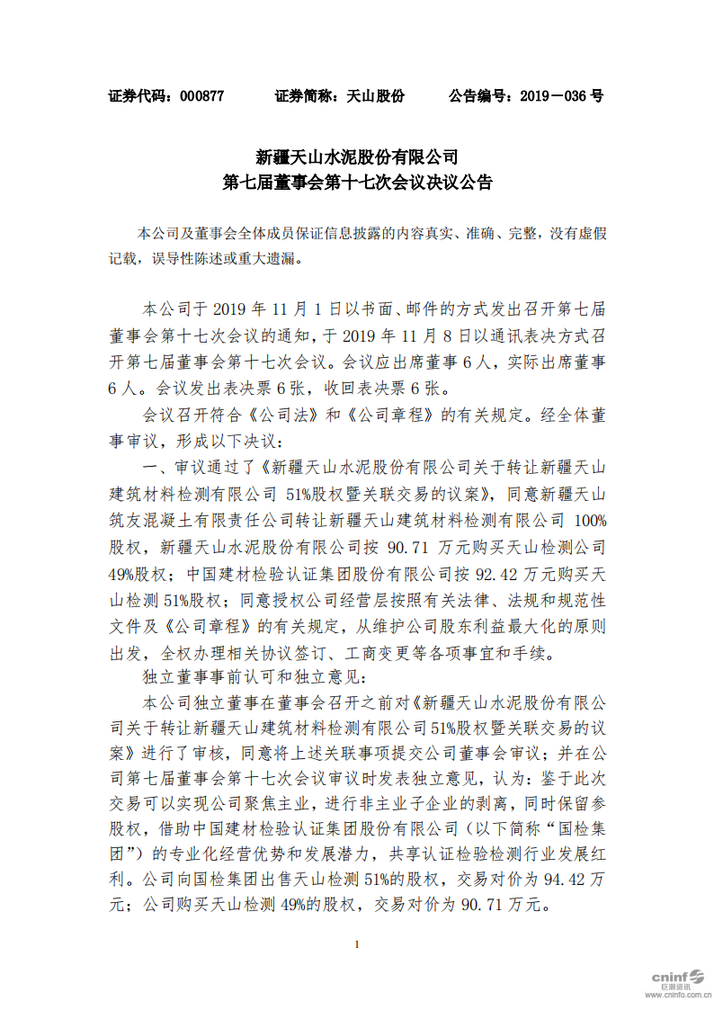 11月8日,天山股份公布,公司于2019年11月8日以通訊表決方式召開第七屆董事會第十七次會議,審議通過了《新疆天山水泥股份有限公司關于轉讓新疆天山建筑材料檢測有限公司51%股權暨關聯交易的議案》。