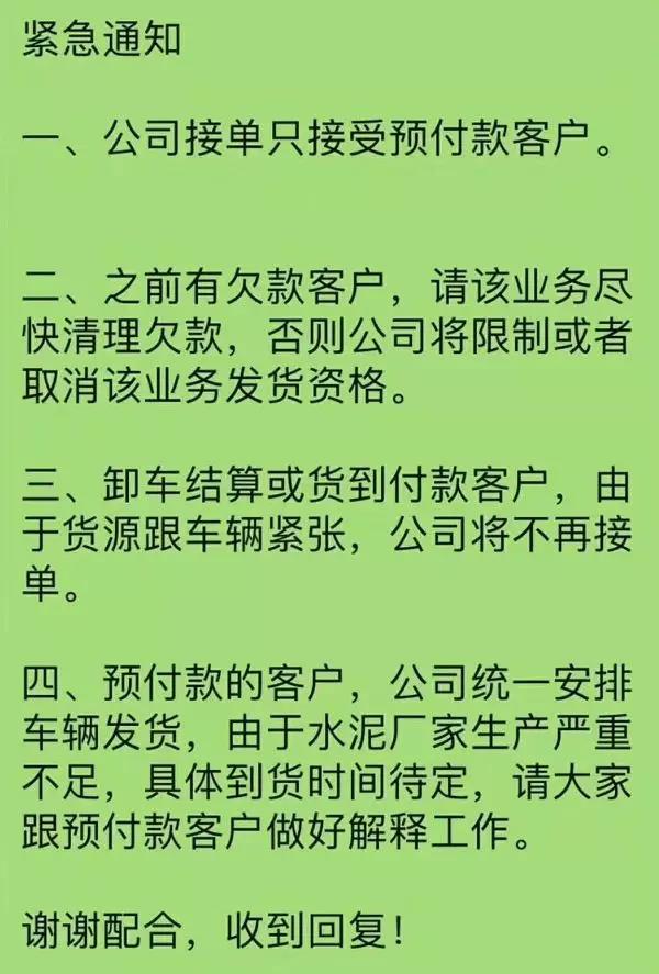 日前,山西省區(qū)域某水泥企業(yè)發(fā)出緊急通知稱,公司只接受預(yù)付款客戶,之前欠款客戶未清理欠款的將限制或取消發(fā)貨資格,卸車結(jié)算或貨到付款客戶,由于貨源、車輛緊張,公司將不再接單。預(yù)付款的客戶公司統(tǒng)一安排車輛發(fā)貨,由于水泥廠家生產(chǎn)嚴(yán)重不足,具體到貨時(shí)間待定。
