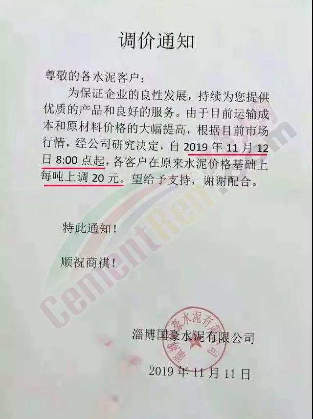 淄博國豪水泥有限公司調(diào)價(jià)通知稱,由于目前運(yùn)輸成本和原材料價(jià)格的大幅提高,根據(jù)目前市場行情,經(jīng)公司研究決定,自11月12日早8時(shí)起,在原來水泥價(jià)格基礎(chǔ)上每噸上調(diào)20元。