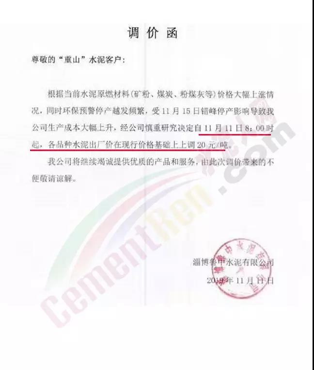 泥原燃材料(礦粉、煤炭、粉煤灰等)價(jià)格大幅上漲情況,同時(shí)環(huán)保預(yù)警停產(chǎn)越發(fā)頻繁,受11月15日錯(cuò)峰停產(chǎn)影響導(dǎo)致公司生產(chǎn)成本大幅上升,經(jīng)公司慎重研究決定 自11日早8時(shí)起,各品種水泥出廠價(jià)在現(xiàn)行價(jià)格基礎(chǔ)上上調(diào)20元/噸。