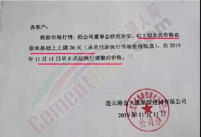 昨日江蘇多家企業(yè)通知上調(diào)水泥價(jià)格。其中連云港金大地新型建材有限公司通知,42.5級(jí)水泥自11月11日早8點(diǎn)起上調(diào)20元/噸。