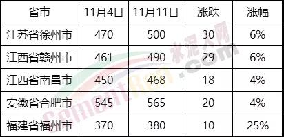 小編注意到,本周商品混凝土價(jià)格與上周相比多有上漲。其中江蘇省徐州市C30混凝土較上周上調(diào)了30元/方,江西省贛州市較上調(diào)上調(diào)了29元/方,漲幅均達(dá)到6%。