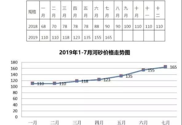 在湖北黃岡,河砂價(jià)格從2018年1月的每噸68元上漲到今年7月的165元,上漲幅度高達(dá)143%;