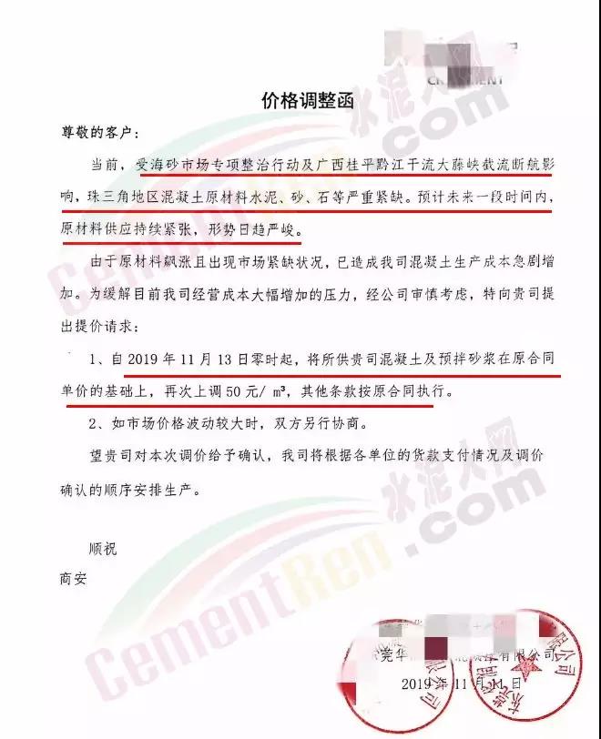 由上圖可以看到,近兩月廣東珠三角地區(qū)混凝土價格大幅上漲,其中東莞地區(qū)多輪上漲,此次上漲已第三波調(diào)價,單次漲幅為50-60元/方,累計漲幅100元/方。整體價格即將突破600元/方大關(guān)。下圖附東莞市各企業(yè)混凝土調(diào)價函通知
