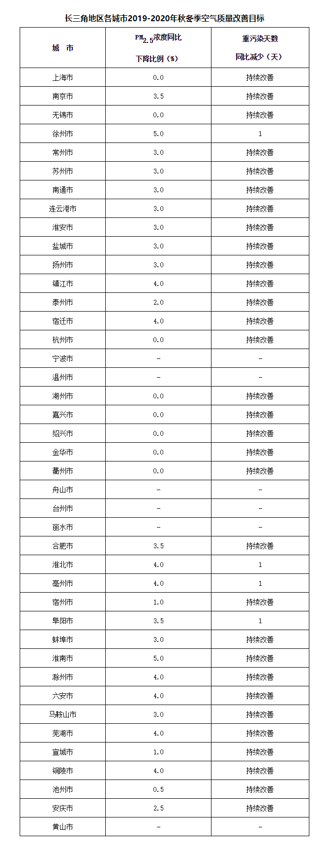 附件:1.長三角地區(qū)各城市2019-2020年秋冬季空氣質量改善目標