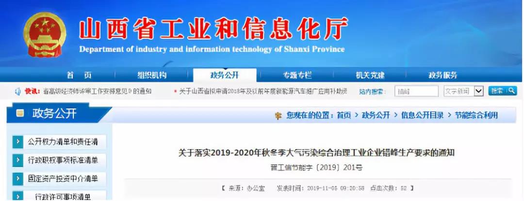 同屬汾渭平原,近日山西省工業(yè)和信息化廳山西省生態(tài)環(huán)境廳也發(fā)布了關(guān)于《關(guān)于落實2019-2020年秋冬季大氣污染綜合治理工業(yè)企業(yè)錯峰生產(chǎn)要求的通知》