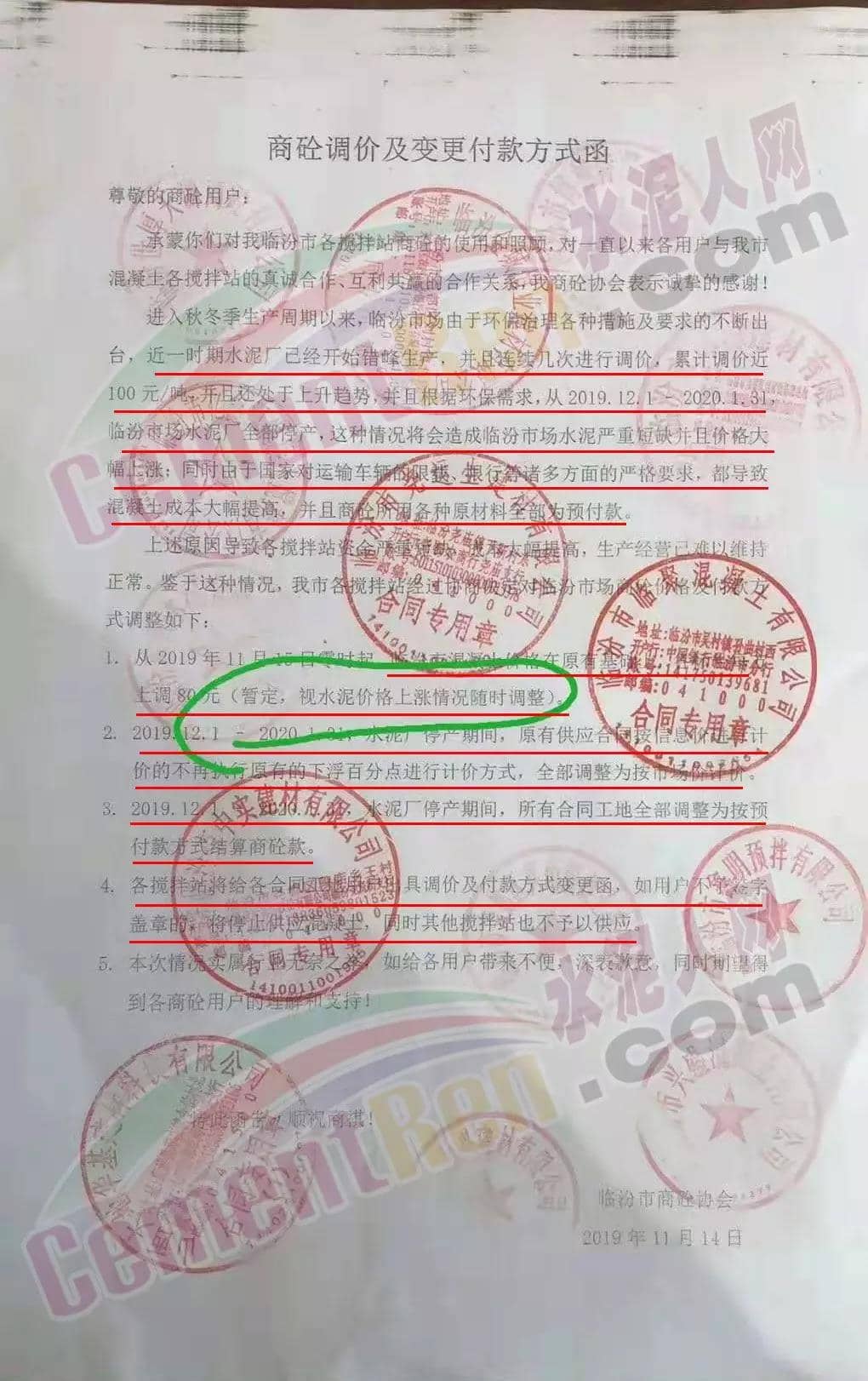 一、2019年11月15日零時起,臨汾市混凝土價格在原基礎上上調80元/噸。(暫定,視水泥價格上漲情況隨時調整)。