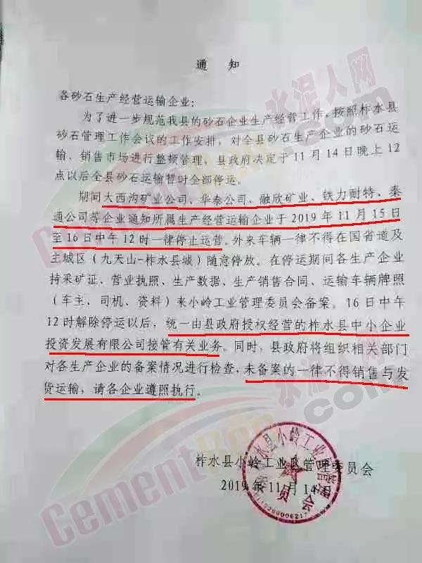 陜西省商洛市柞水縣小嶺工業(yè)區(qū)管理委員會發(fā)通知給砂石生產經營運輸企業(yè)稱,為進一步規(guī)定縣域境內的砂石企業(yè)生產經營工作。按照縣砂石管理工作會議的工作安排 ,對全縣砂石生產企業(yè)的砂石運輸,銷售市場進行整頓管理。縣政府決定于11月14日晚上12時以后全縣砂石運輸暫時全部停運。