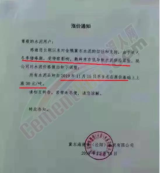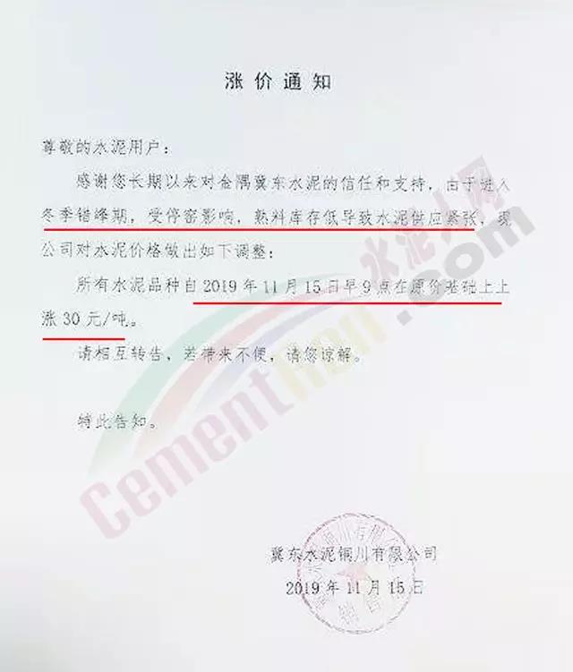 不僅砂石,昨日陜西關中地區(qū)冀東,聲威,堯柏等多家主導企業(yè)通知上調水泥價格。銅川冀東水泥漲價通知稱,由于進入冬季錯峰期,受停窯影響,熟料庫存低導致水泥供應緊張。所有水泥品種自11月15日早9點在原價基礎上上調30元/噸。