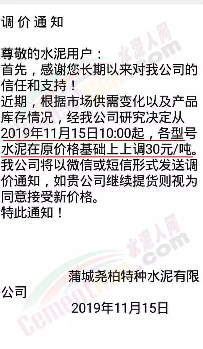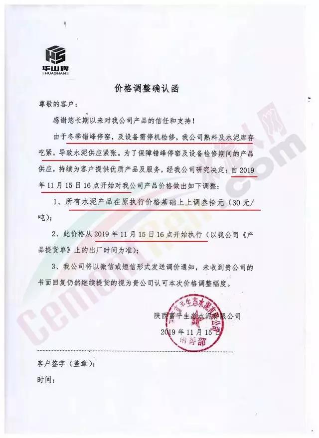 陜西富平生態(tài)水泥有限公司價格調整確認函稱,由于冬季錯峰停窯及設備需停機檢修,公司熟料及水泥庫存吃緊,導致水泥供應緊張。為保障錯峰停窯及設備檢修期間的產品供應,經公司研究決定自11月15日16時起對公司產品價格上調30元/噸。