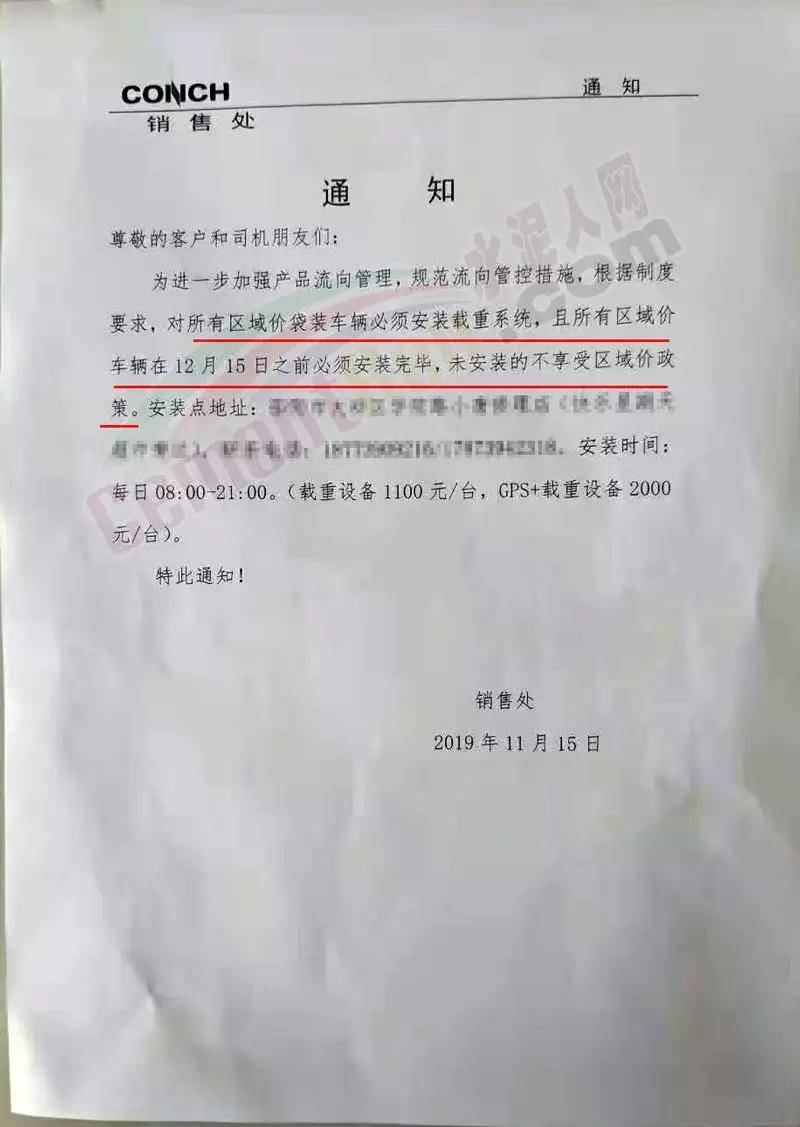 日前,海螺水泥湖南紹陽公司通知為進一步強強產品流向管理,規(guī)范流向管控措施,根據(jù)制度要求,對所有區(qū)域價袋裝車輛必須安裝載重系統(tǒng),且所有區(qū)域價車輛在下月15日前必須安裝完畢,未安裝的不享受區(qū)域價政策。其中載重設備1100元/臺,GPS+載重設備2000元/臺。