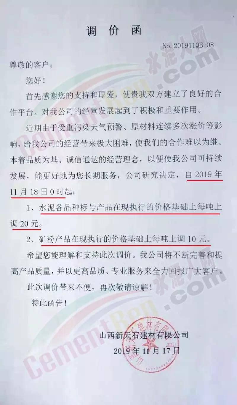 同一天,山西新天石建材有限公司發(fā)調(diào)價(jià)函稱,近期由于受重污染天氣預(yù)警、原材料連續(xù)多次漲價(jià)等影響,給公司的經(jīng)營(yíng)帶來(lái)極大困難。經(jīng)公司研究決定自今日(11月18日)0時(shí)起:水泥各品種標(biāo)號(hào)產(chǎn)品在現(xiàn)執(zhí)行的價(jià)格基礎(chǔ)上每噸上調(diào)20元;礦粉產(chǎn)品在現(xiàn)執(zhí)行價(jià)格基礎(chǔ)上每噸上調(diào)10元。