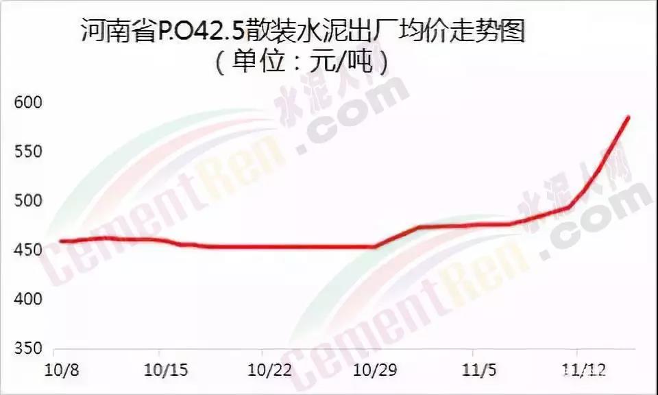 圖1:河南省P.O42.5散裝水泥出廠均價(jià)走勢(shì)圖從圖中可以看出,10月末至今河南省P.O42.5散裝水泥出廠均價(jià)漲幅超過(guò)100元/噸。近期,除少部分地區(qū)上調(diào)30-60元/噸外,多數(shù)區(qū)域水泥價(jià)格漲幅100元/噸以上。