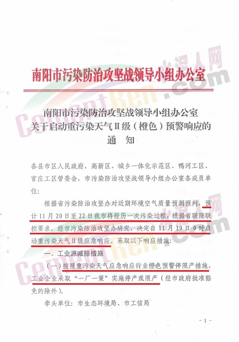 11月18日河南省南陽(yáng)市相繼發(fā)布了《關(guān)于啟動(dòng)重污染天氣二級(jí)(橙色)預(yù)警響應(yīng)的通知》稱(chēng)根據(jù)省污染防治攻堅(jiān)辦對(duì)近期的環(huán)境空氣質(zhì)量預(yù)測(cè)預(yù)判,預(yù)計(jì)11月20日至22日南陽(yáng)市將經(jīng)理一次污染過(guò)程,根據(jù)省聯(lián)防控要求,經(jīng)市污染防控攻堅(jiān)辦研究,決定自11月19日0時(shí)啟動(dòng)重污染天氣二級(jí)應(yīng)急響應(yīng),具體減排措施如下:
