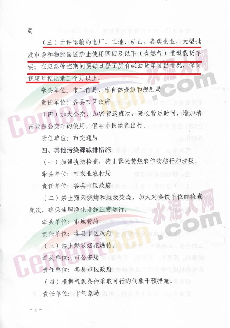 采取黃色(三級(jí))應(yīng)急減排措施期間,禁止使用國(guó)四以下車(chē)輛(含燃?xì)?進(jìn)行物料運(yùn)輸,承擔(dān)運(yùn)輸任務(wù)的國(guó)五、國(guó)六車(chē)輛(含燃?xì)?比例控制在80%以下。