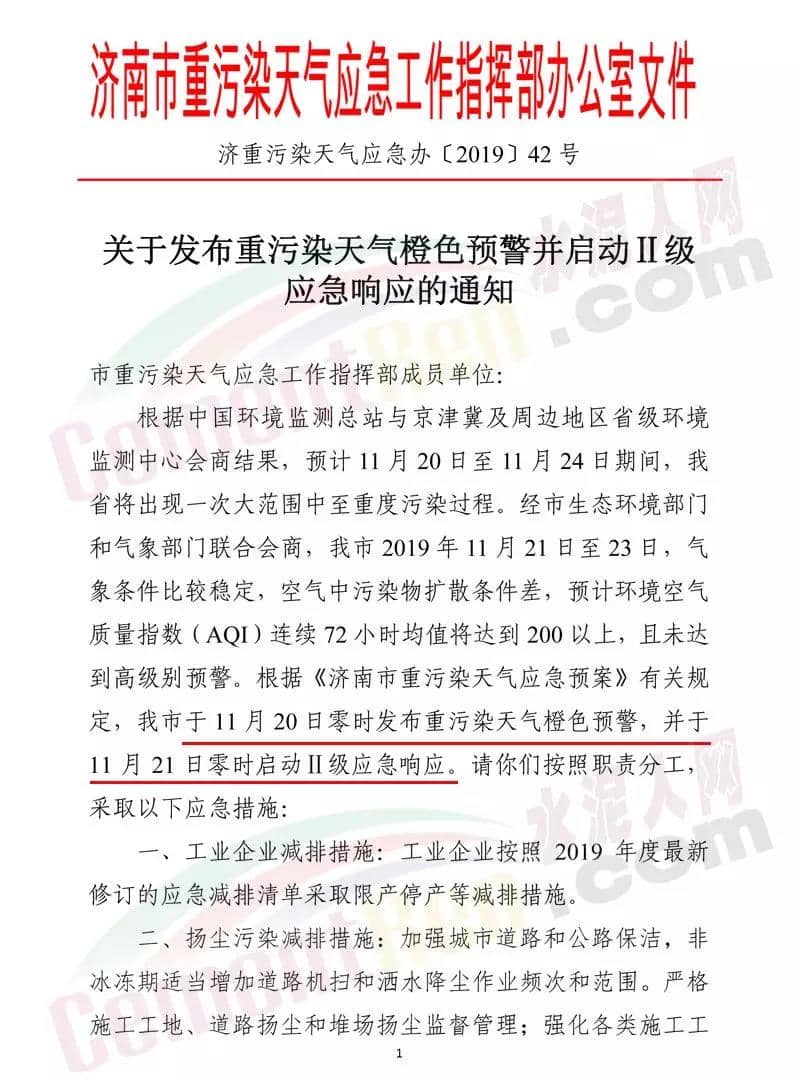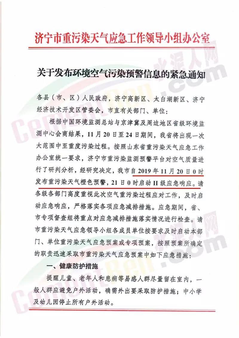 濟(jì)寧市重污染天氣應(yīng)急工作領(lǐng)導(dǎo)小組通知文件稱濟(jì)寧市自11月20日0時(shí)發(fā)布重污染天氣橙色預(yù)警。21日0時(shí)啟動II級應(yīng)急響應(yīng)。